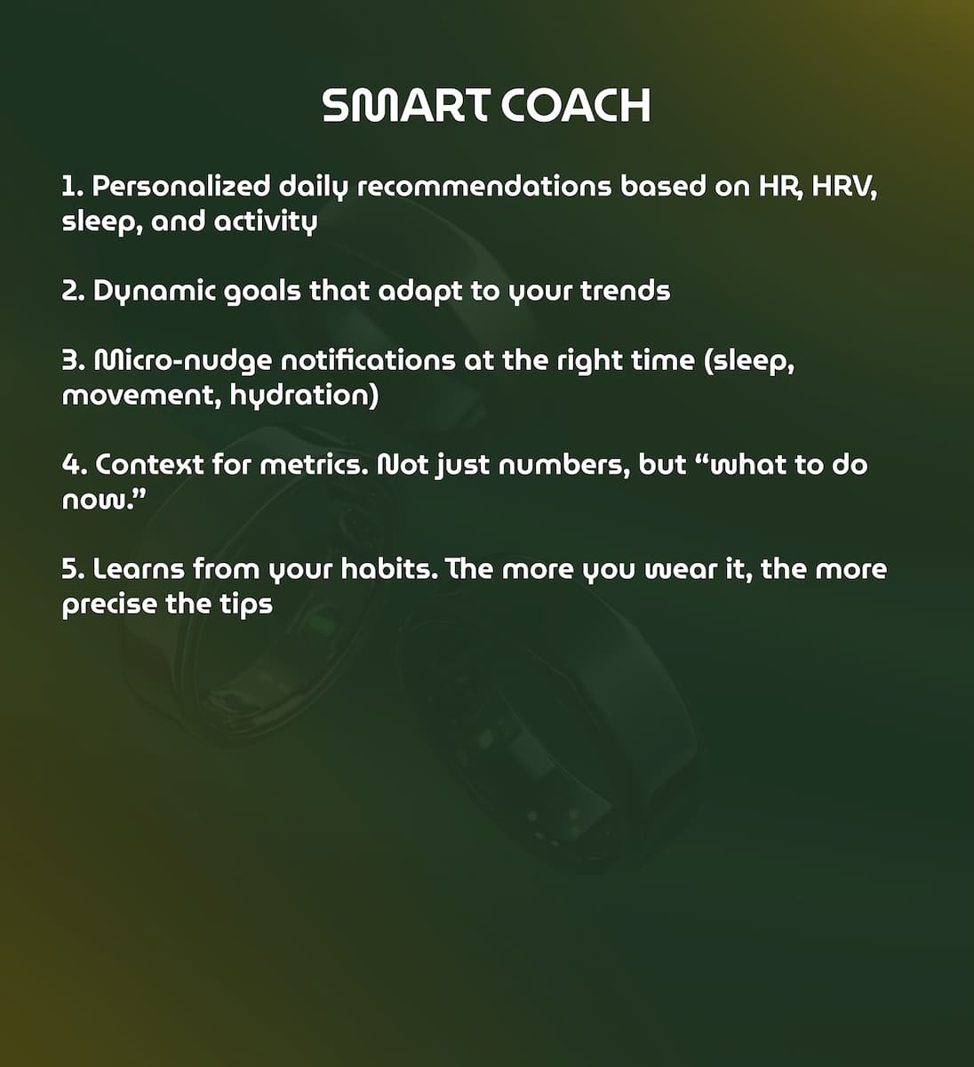 Your built-in AI Coach delivers personalized, insight-driven suggestions based on your daily data — guiding your sleep, stress, and focus with precision.
